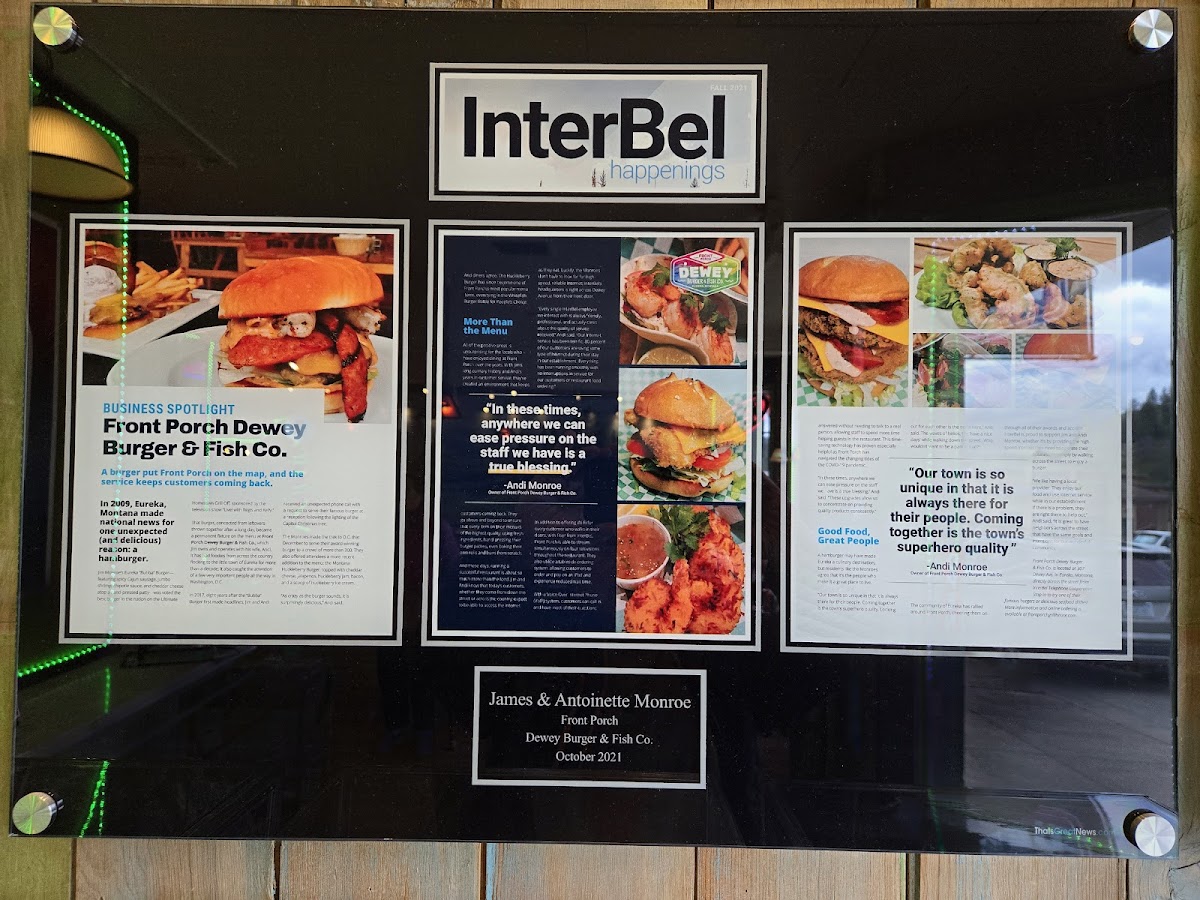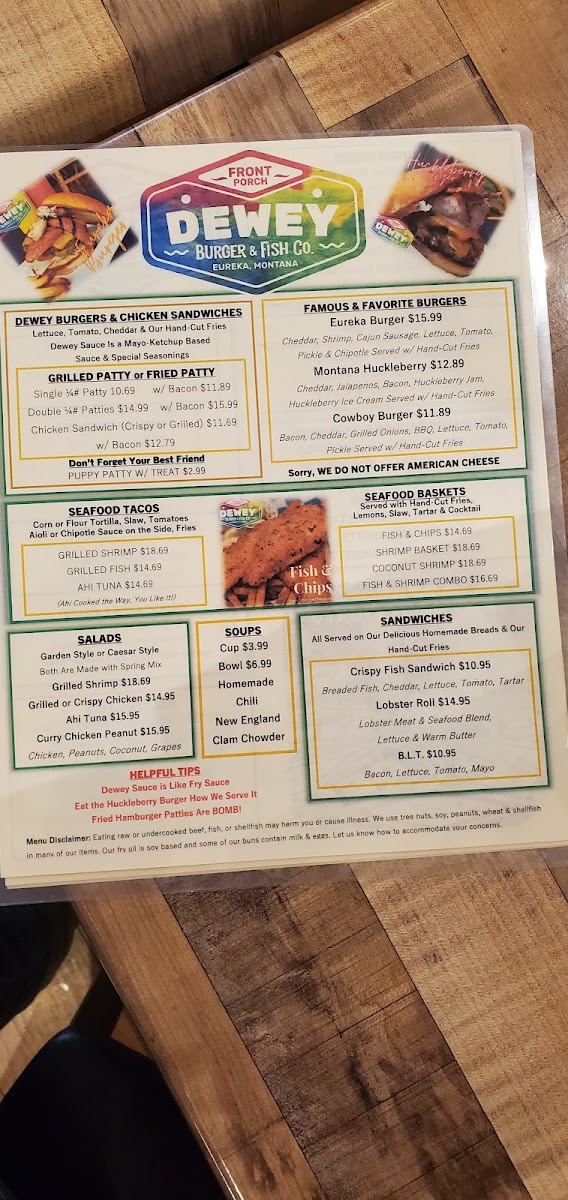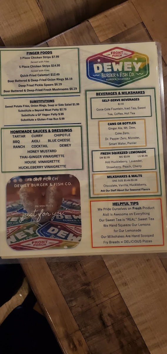 Welcome to Front Porch Dewey Burger & Fish Co., a delightful eatery located in Eureka, Montana. Here, you’ll find a menu that celebrates quality ingredients and creative flavors. The star attractions are their mouth-watering burgers, including the unique Huckleberry Burger, which combines sweet and spicy elements with jalapenos and a surprising scoop of ice cream. The variety extends to fresh salads, like the Buffalo Chicken Salad and Mediterranean options, ensuring there’s something for everyone.